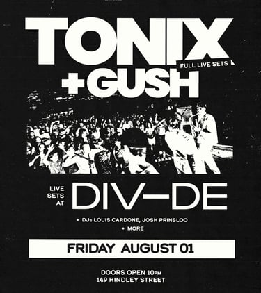 TONIX and GUSH take over DIVIDE on Friday August 1 for a full live, in-the-round set at the stroke of midnight, to debut a new show, new tracks, new party.